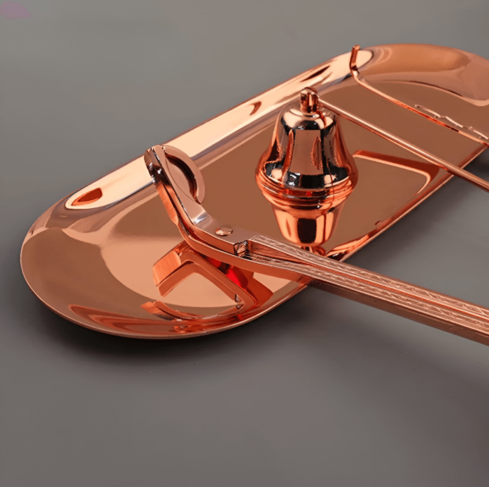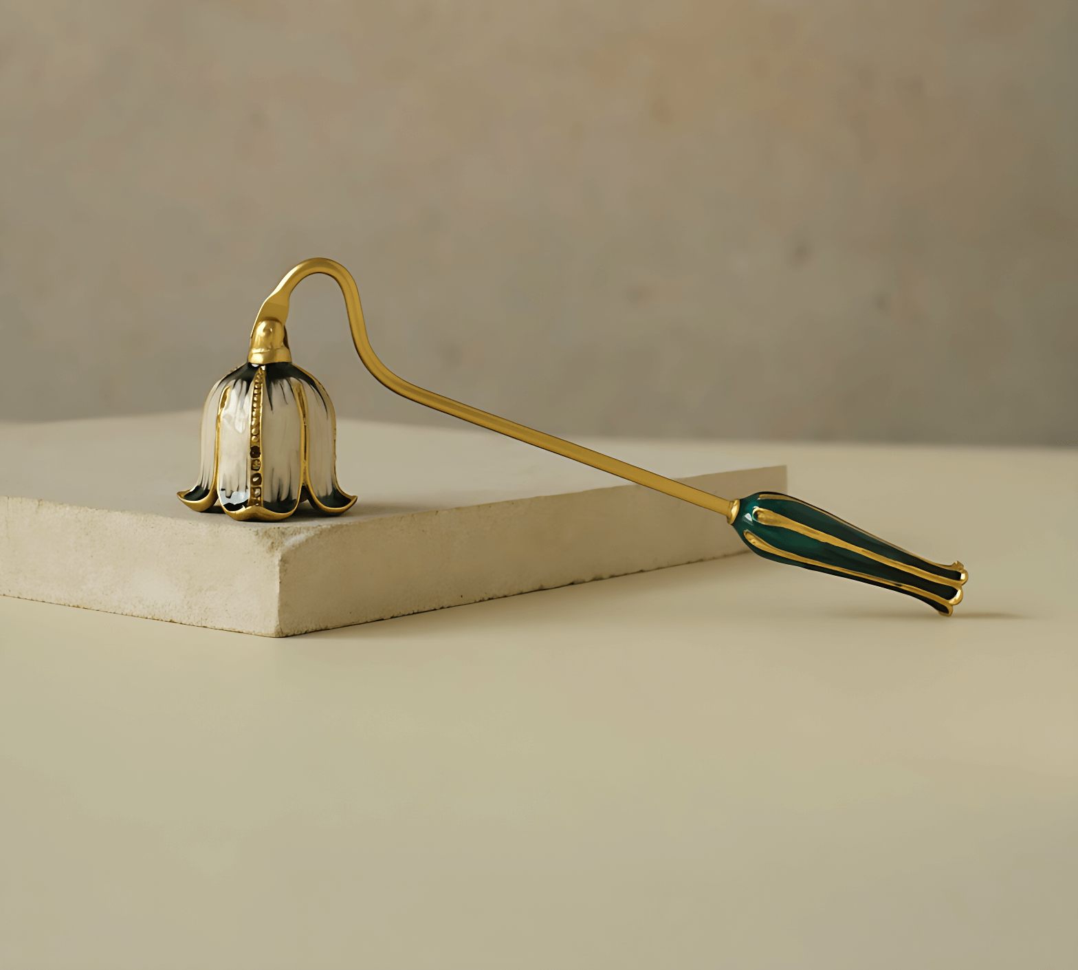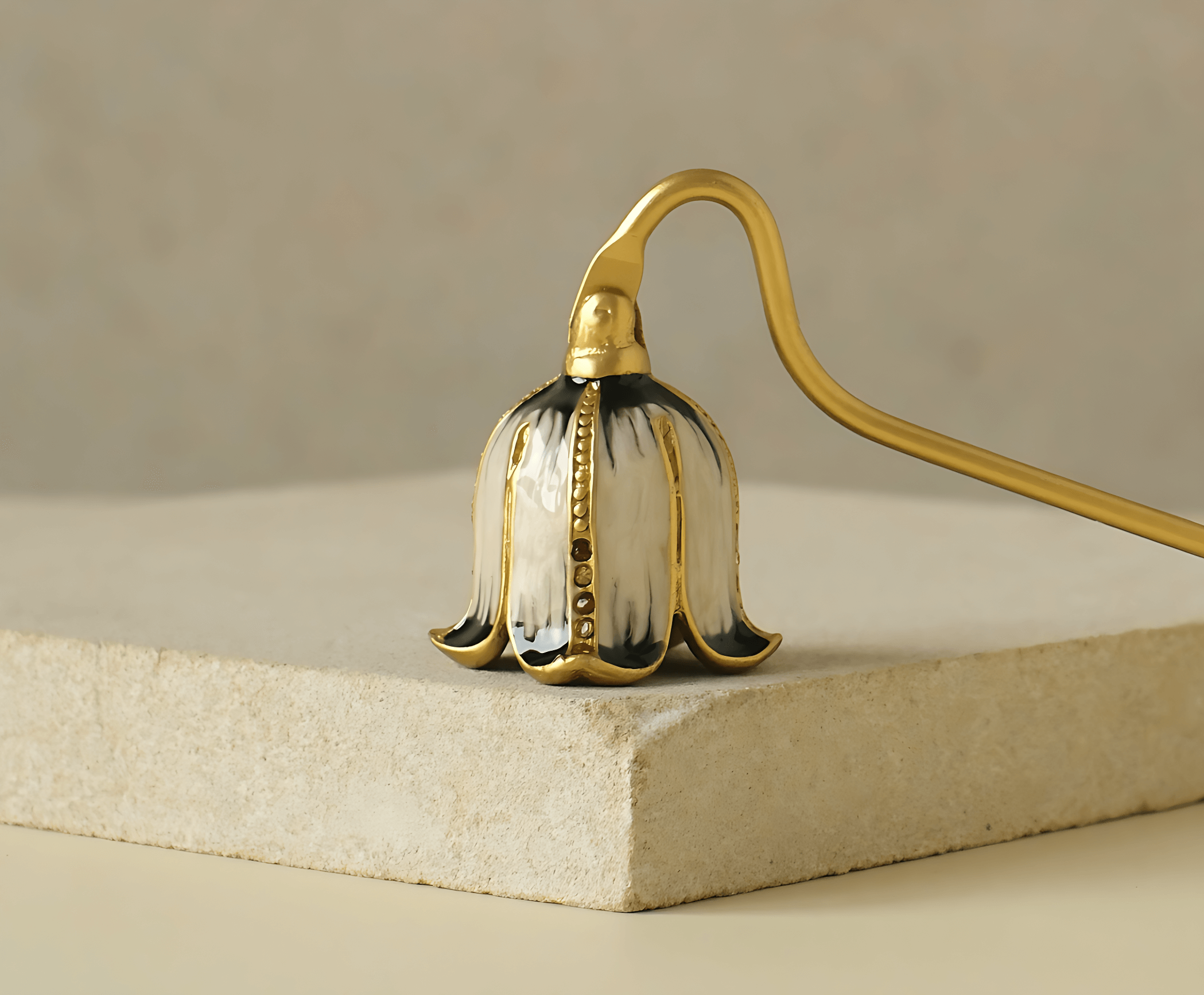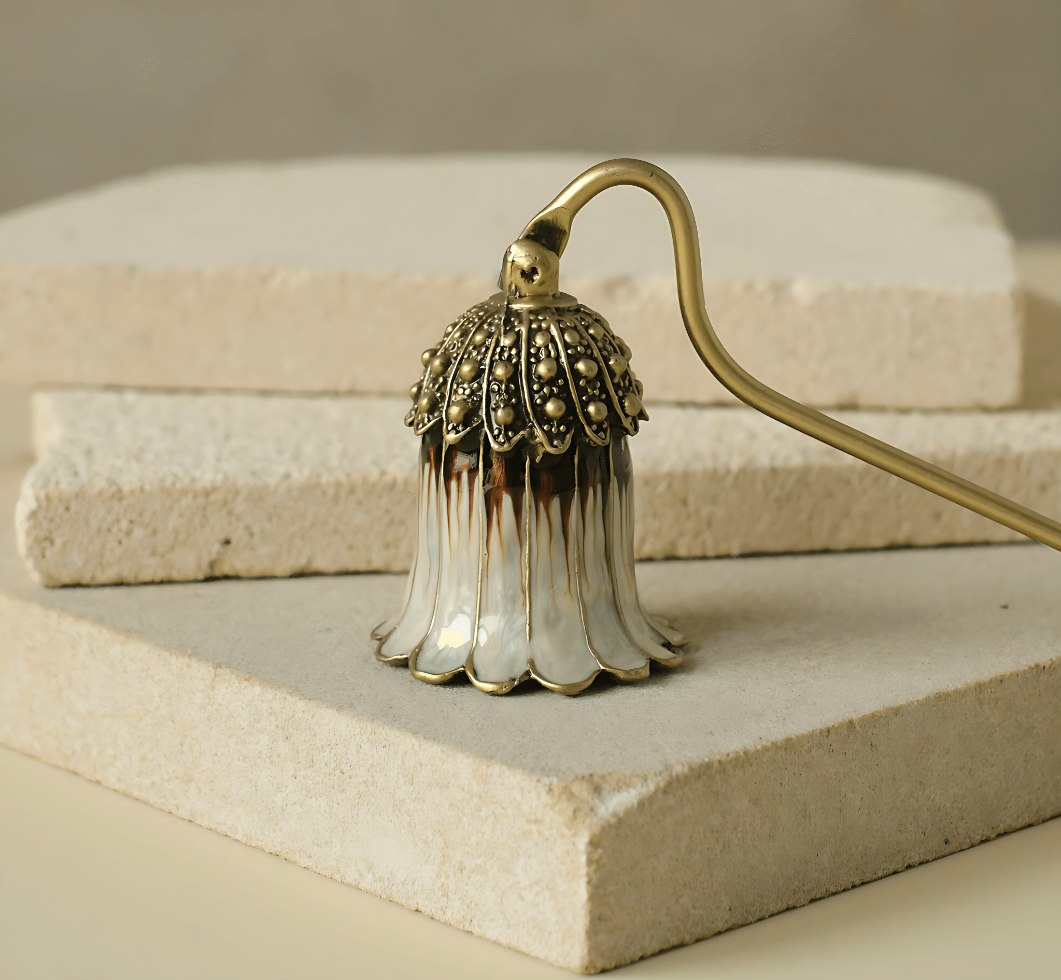 Утончённая вытянутая форма этого гасителя напоминает изящный цветок, склоняющийся под порывом ветра. У его основания — благородный коричневый оттенок, словно стебель, только что собранный в осеннем саду. Этот аксессуар не просто бережно гасит пламя, но и привносит в ваш ритуал лёгкую меланхолию и умиротворение уходящего дня. На золотой ручке играют блики, добавляя образу тепла и завершённости. После использования он остаётся на столе как намёк на природную элегантность и смену времён — даже в самых простых моментах.